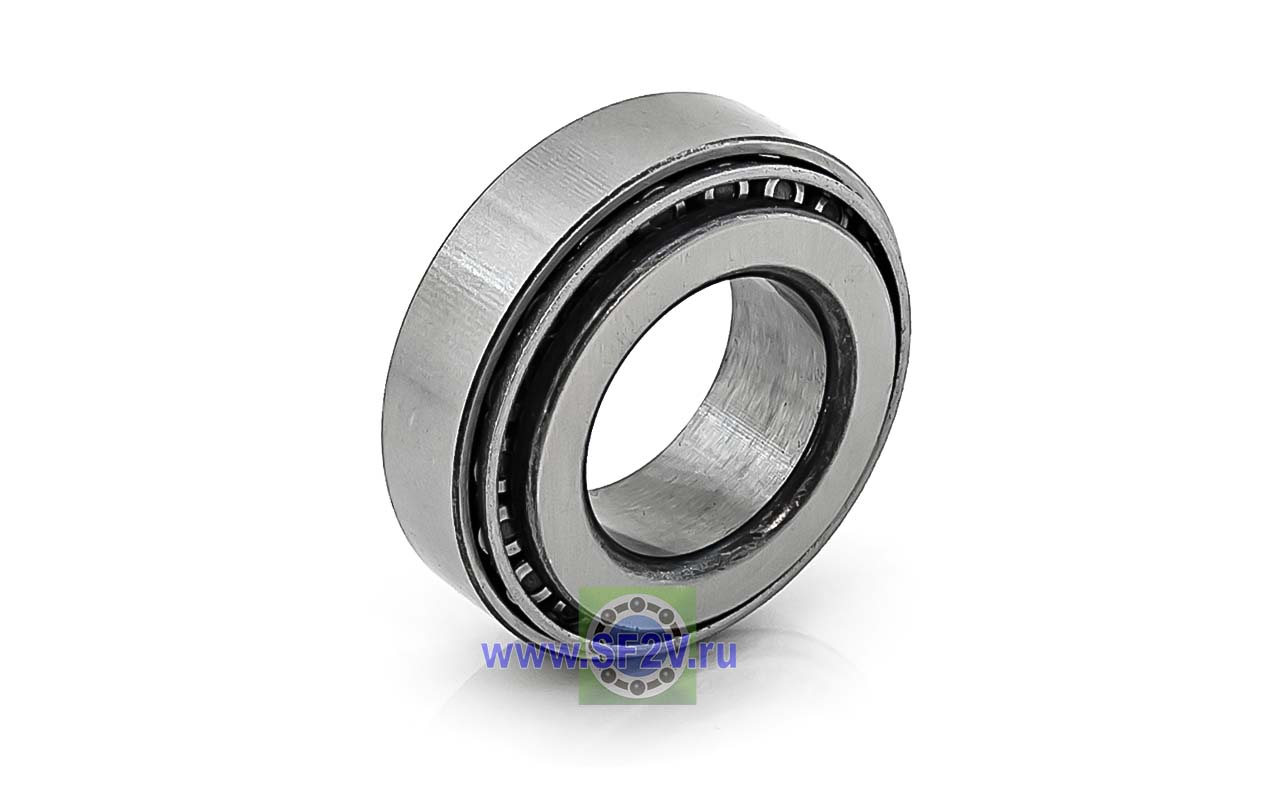 Конический роликовый подшипник, однорядный, предназначен для эксплуатации в подшипниковых узлах с высокими радиальными и осевыми нагрузками, имеет возможность регулировки как осевого так и радиального зазора. Конические роликоподшипники имеют дорожки качения внутреннего и наружного колец, между которыми находится комплект конических роликов. Если образующие конических поверхностей продолжить, то они сойдутся в одной точке, которая находится на оси подшипника. Это означает, что условия качения являются оптимальными. Конические роликоподшипники хорошо воспринимают комбинированные нагрузки (радиальные и осевые). Способность подшипника нести осевую нагрузку в большей степени определяется углом контакта, который соответствует углу дорожки качения наружного кольца. Чем больше угол, тем больше грузоподъемность по осевой нагрузке. Конические роликоподшипники имеют разъемную конструкцию, т.е. внутреннее кольцо с роликами и сепаратором образуют блок, который может быть смонтирован отдельно от наружного кольца. Конические роликоподшипники бывают однорядные, двухрядные и четырехрядные. Но в основном производители выпускают однорядные конические роликоподшипники. Однорядные конические роликоподшипники способны воспринимать только односторонние осевые нагрузки. При радиальных нагрузках в подшипнике возникает осевое усилие, которому необходимо противодействовать. Поэтому однорядные конические роликоподшипники обычно устанавливают так, что на другом конце вала стоит второй конический роликоподшипник.
