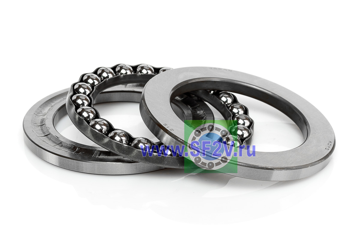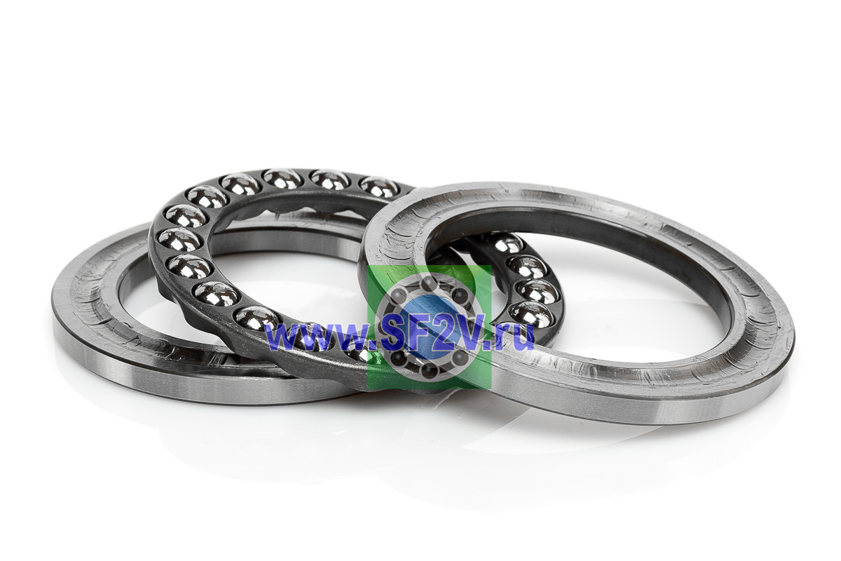 Упорный шарикоподшипник одинарный разборный. Воспринимают только осевые нагрузки и жестко фиксируют положение вала. Применимы для опор тихоходных валов, задвижек, крюков мостовых кранов, поворотных и нажимных устройств и т.д.