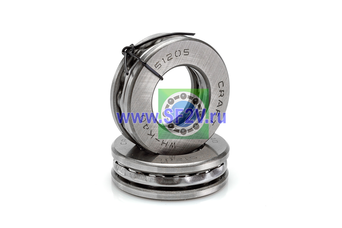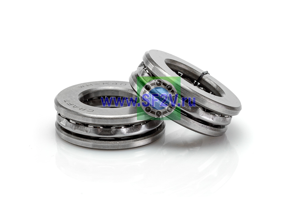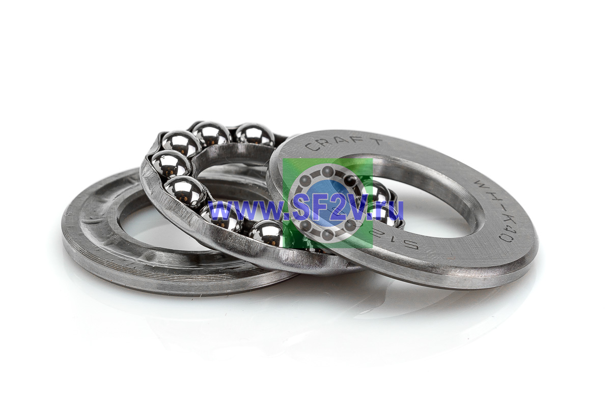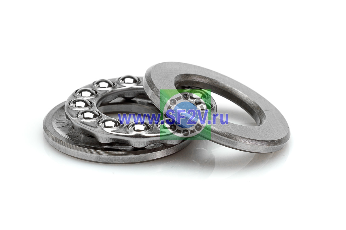 Упорный шарикоподшипник одинарный разборный. Воспринимают только осевые нагрузки и жестко фиксируют положение вала. Применимы для опор тихоходных валов, задвижек, крюков мостовых кранов, поворотных и нажимных устройств и т.д.