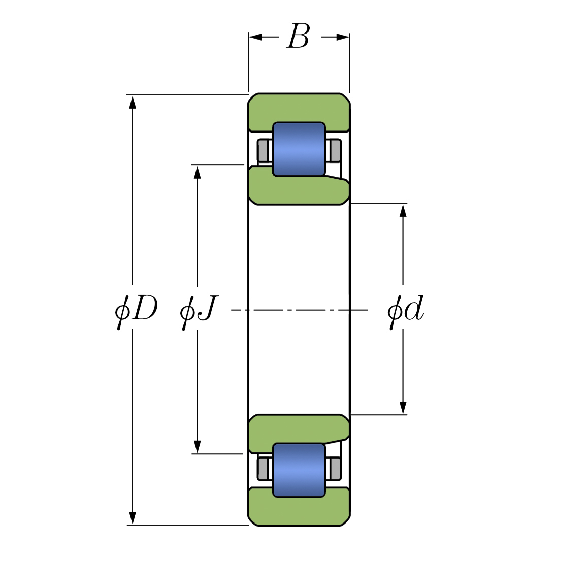Однорядный роликовый подшипника типа NJ имеет два бортика на внешнем кольце и один на внутреннем, что позволяет обеспечить одностороннюю осевую фиксацию/подвижность подшипниковой системы. Увеличенный радиальный(тепловой) зазор необходим в условиях прессовой посадки обоих колец, недостаточном охлаждении подшипникового узла, резких и частых сменах режимов работы подшипника (скорость, температура).