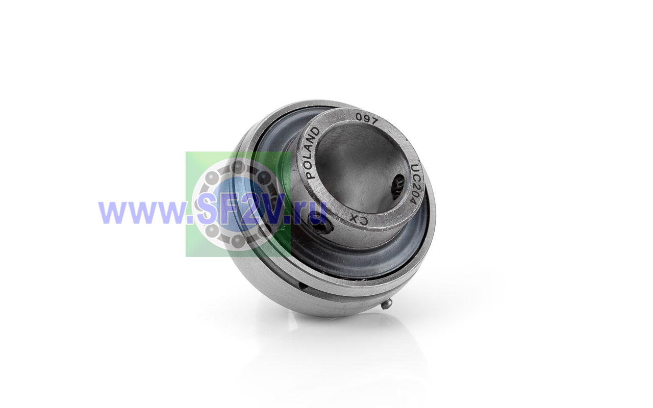 Шариковый подшипник, корпусной, закрытый с 2-х сторон. Крепление на вал с помощью затяжных болтов на внутреннем кольце. Подшипник типа UC – это корпусный подшипник, который используется для установки в корпусные подшипниковые узлы всех типов. Подшипник имеет сферическую наружную обойму, а корпус - сферическое посадочное отверстие. Такая конструкция позволяет подшипнику слегка перемещаться в корпусе, за счет чего компенсируется перекос вала или неточность монтажа. Крепление подшипника на валу осуществляется при помощи стопорных винтов. Кроме того, у такого подшипника есть специальные отверстия для замены смазки. Подшипники типа UC применяются в основном в качестве опор коротких валов, а также для тех мест установки, где возможно лишь небольшое тепловое линейное расширение. Осевые зазоры подшипника компенсируют небольшие удлинения вала. Подшипники типа UC применяются при нормальных нагрузках, низких или средних скоростях вращения.